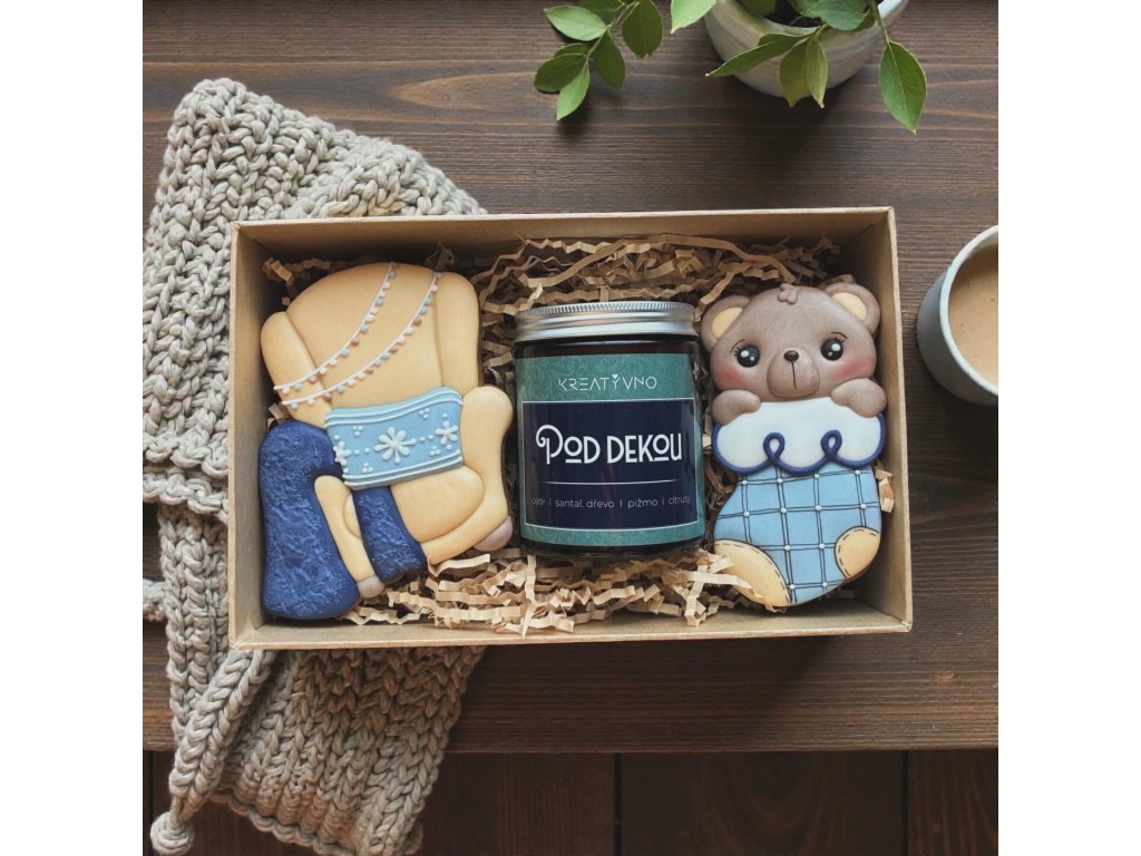 Tento dárkový box ukrývá dva dekorativní perníčky, které dokreslují téma boxu a vůni svíčky Pod dekou - jemnou, hřejivou a sametovou, která provoní domov a navodí pocit zabalení do oblíbené deky.