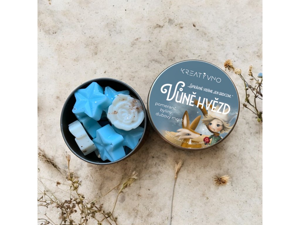 Elegantní kovová krabička ukrývá ručně vyráběný vonný vosk do aromalampy ve tvaru růžiček a hvězdiček. Jemná, něžná vůně s názvem „Vůně hvězd“ provoní domov a navodí atmosféru klidu.